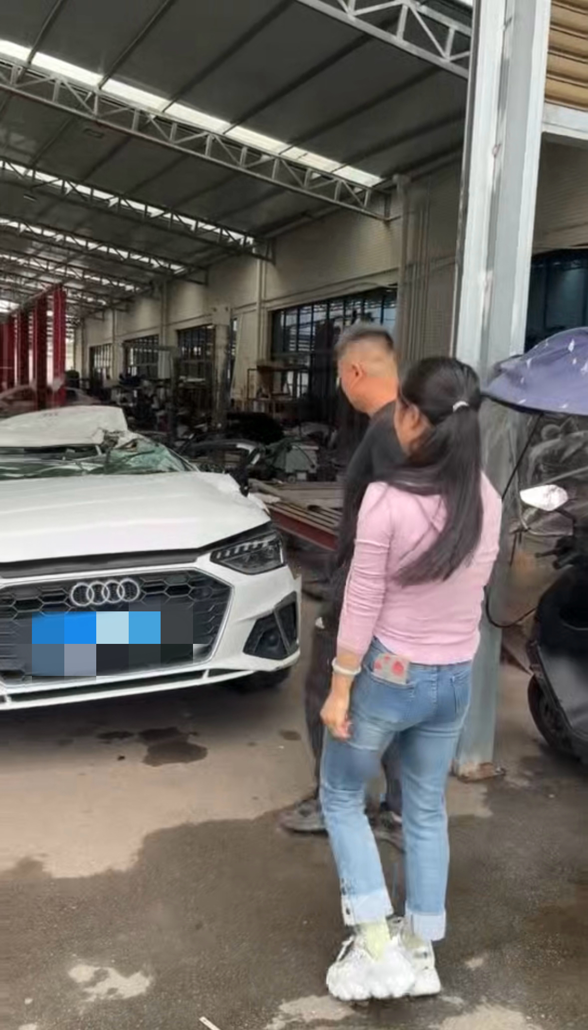 李先生和配头在汽修厂,与这辆和我方有过命交情的轿车告别