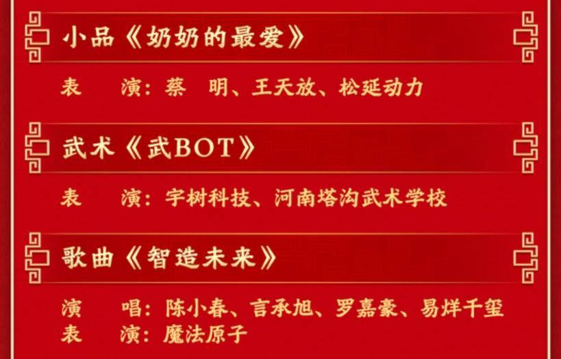 节目单袒露,松延能源、宇树科技、魔法原子等多家机器东说念主公司将登上春晚舞台。其中,客岁在春晚扭秧歌破圈的宇树科技机器东说念主将与河南塔沟技击学校共同带来技击扮演,松延能源与蔡明、王天放扮演小品《奶奶的最爱》,魔法原子则在陈小春、言承旭、罗嘉豪、易烊千玺等东说念主的歌曲《智造将来》中进行扮演。星河通用将与沈腾、马丽一同出当今贺岁微电影中。