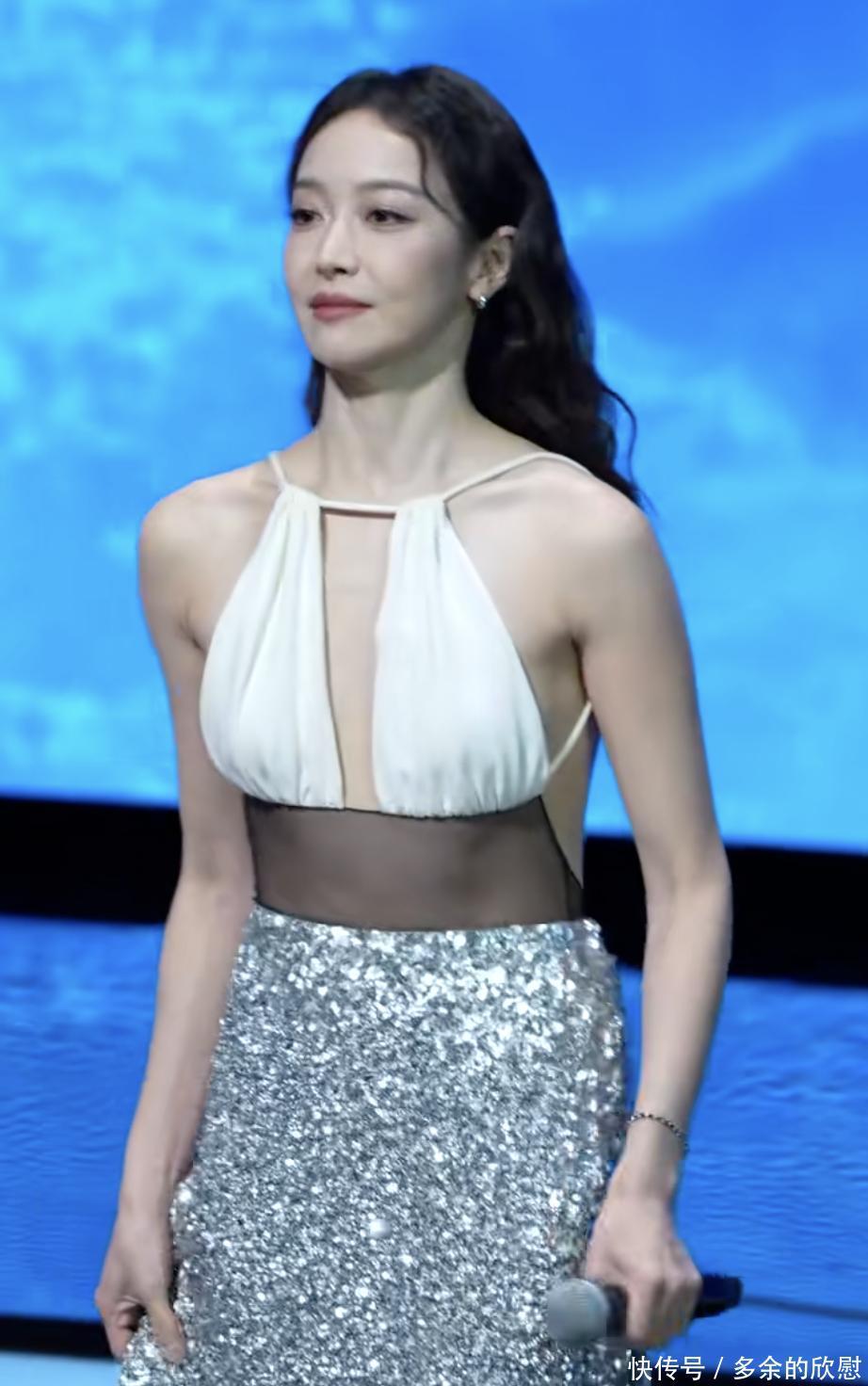 晚上的征服很火辣,白色抹胸拼blingbling的灰色长裙,背面直爽一派,性感娇媚,头发大浪潮,看上去比骨子年齿要大。
