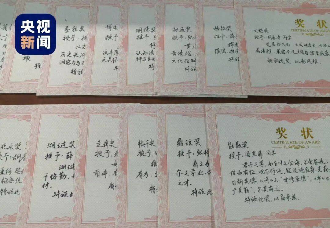 为了此次的奖状,他花了近两周本事构想,对照学生的课堂进展、日常细节,旁求博考、惜墨若金。每张奖状的奖项称呼、文言考语,齐是为孩子量身定制的“专属”。