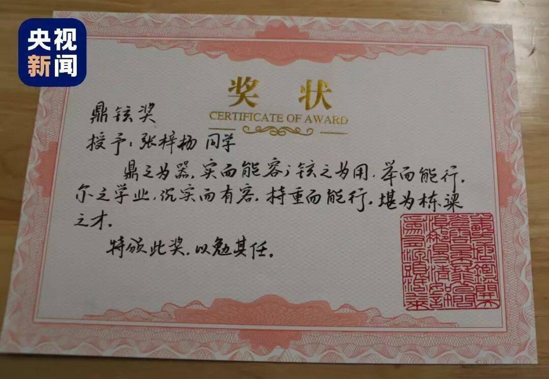“鼎铉奖”授予张梓杨。“鼎之为器,实而能容;铉之为用,举而能行。”张梓杨同学性情千里稳,吕嘉珩以古器喻东谈主,维持他千里稳能容,告诉他器虽不张扬,但额外的东谈主和事物总会被看见,也交付了对他成为栋梁的急切渴望。