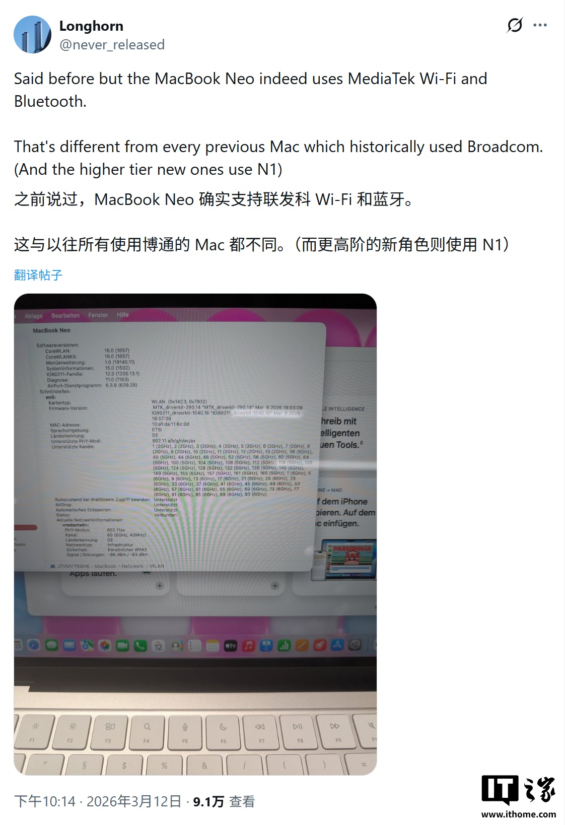IT之家 3 月 13 日音信体育游戏app平台,音信源 Longhorn 昨日(3 月 12 日)在 X 平台发布推文,指出在 MacBook Neo 条记本上,苹果初度在 Mac 居品线中莫得使用博通(Broadcom)或苹果自研 N1 芯片,转而给与联发科(MediaTek)的 Wi-Fi 与蓝牙收罗芯片。
