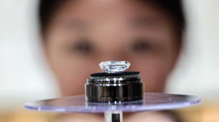 图为东谈主造钻石制品诱骗破钞者不雅赏。 王中举摄